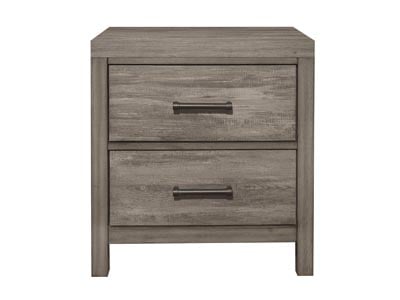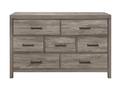 Following the trend of rusticated simplicity is the Driftwood 6 Piece Bedroom Collection. Melamine laminate perfectly mimics the look of weathered gray wood, lending to the rustic style. The transitional framing of the collection allows for placement in myriad bedroom settings, creating the perfect canvas for your preferred decorative style. Black metal bar hardware fronts the drawers of the nightstand, dresser, mirror, chest and storage footboard, providing complementing contrast to the gray finish.