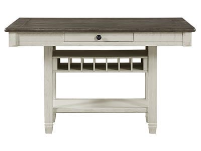 The Granby Counter Height Table is a beautiful modern farmhouse style dining option. This gorgeous table is highlighted by the warm brown top that showcases the natural wood grain and the white-washed base. A drawer and storage spaces make this a great addition to any dining space.
